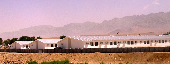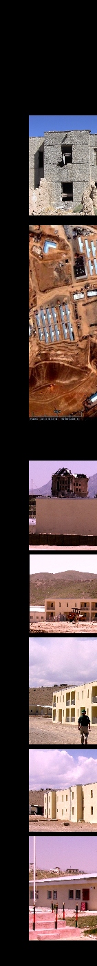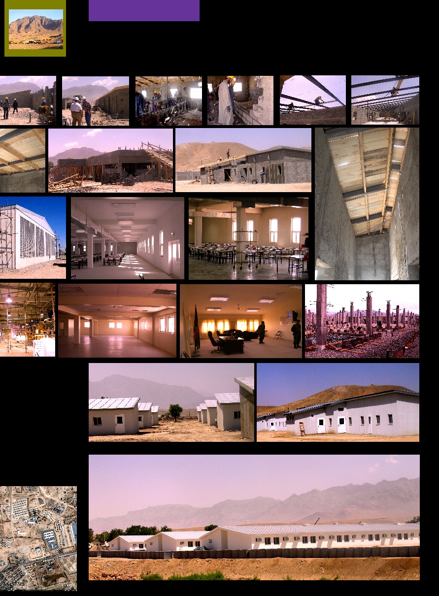 The scope of this project consisted of a Master Plan, the design of various buildings including new construction, renovation, alteration, repairs, and roadways. Facilities in this project included offices, living quarters, dining facilities, power plants, and waste treatment facilities. Other works included site work, water wells, elevated water storage, road network, paving, resurfacing, drainage swales, and fencing, communications, and security protections. Perini and the Design team including Azad Architects arrived in Kabul, Afghanistan on January 19, 2003, ten days after the award of the project and set up operations and conducted field surveys and investigations. The site needed to be cleared of landmines. By the Spring of 2003 the design packages were completed and the construction began. By the end of summer 2003 the project was successfully completed and occupied by the new Afghan recruits. |